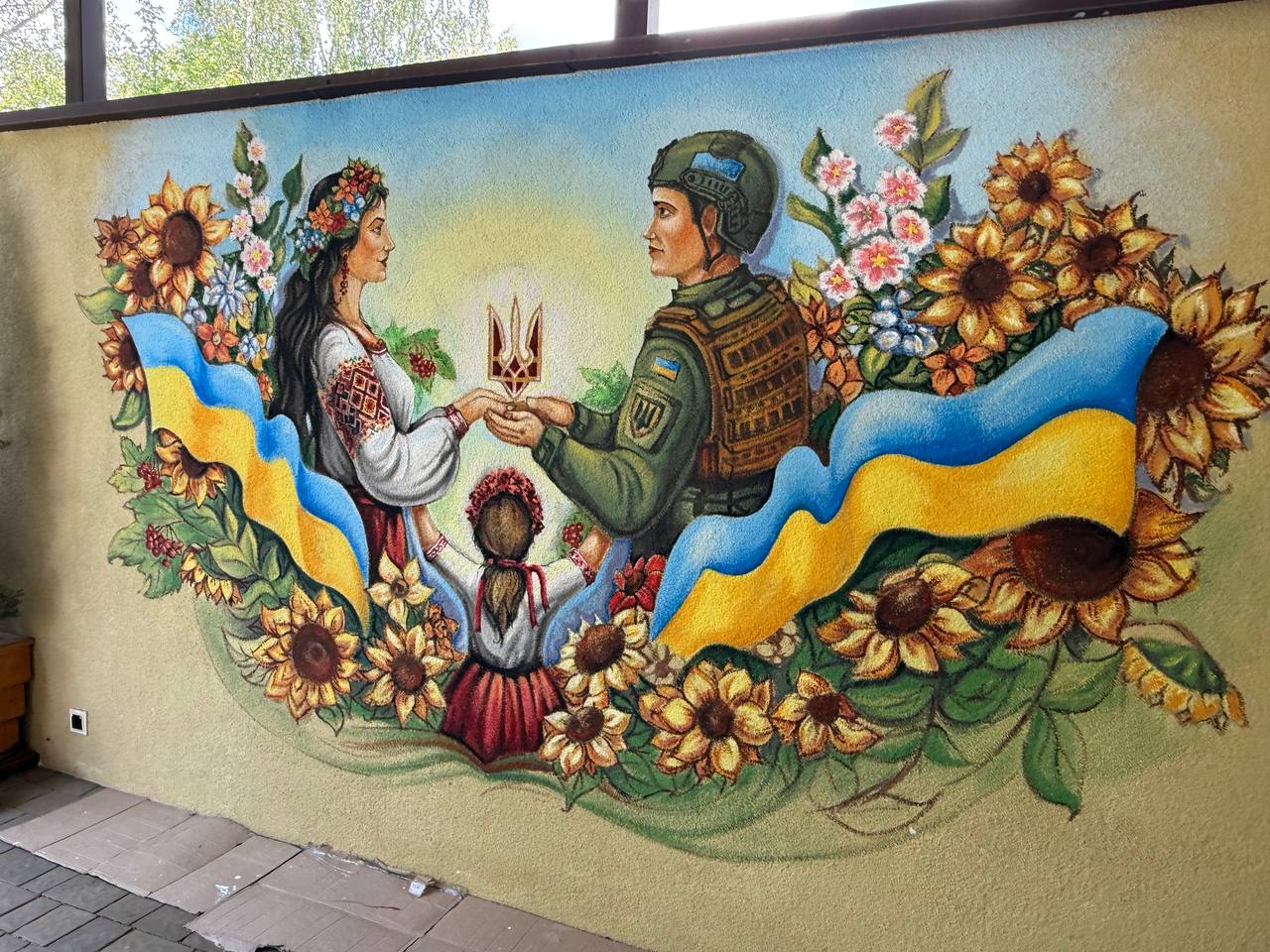 На муралі зображені українська жінка у вишиванці та військовослужбовець Збройних Сил України, що повернувся з фронту. Разом зі своєю донькою вони у долонях тримають національний герб – Тризуб. Також зображені символи нашої природньої ідентичноссті: соняхи, калина, мальви.