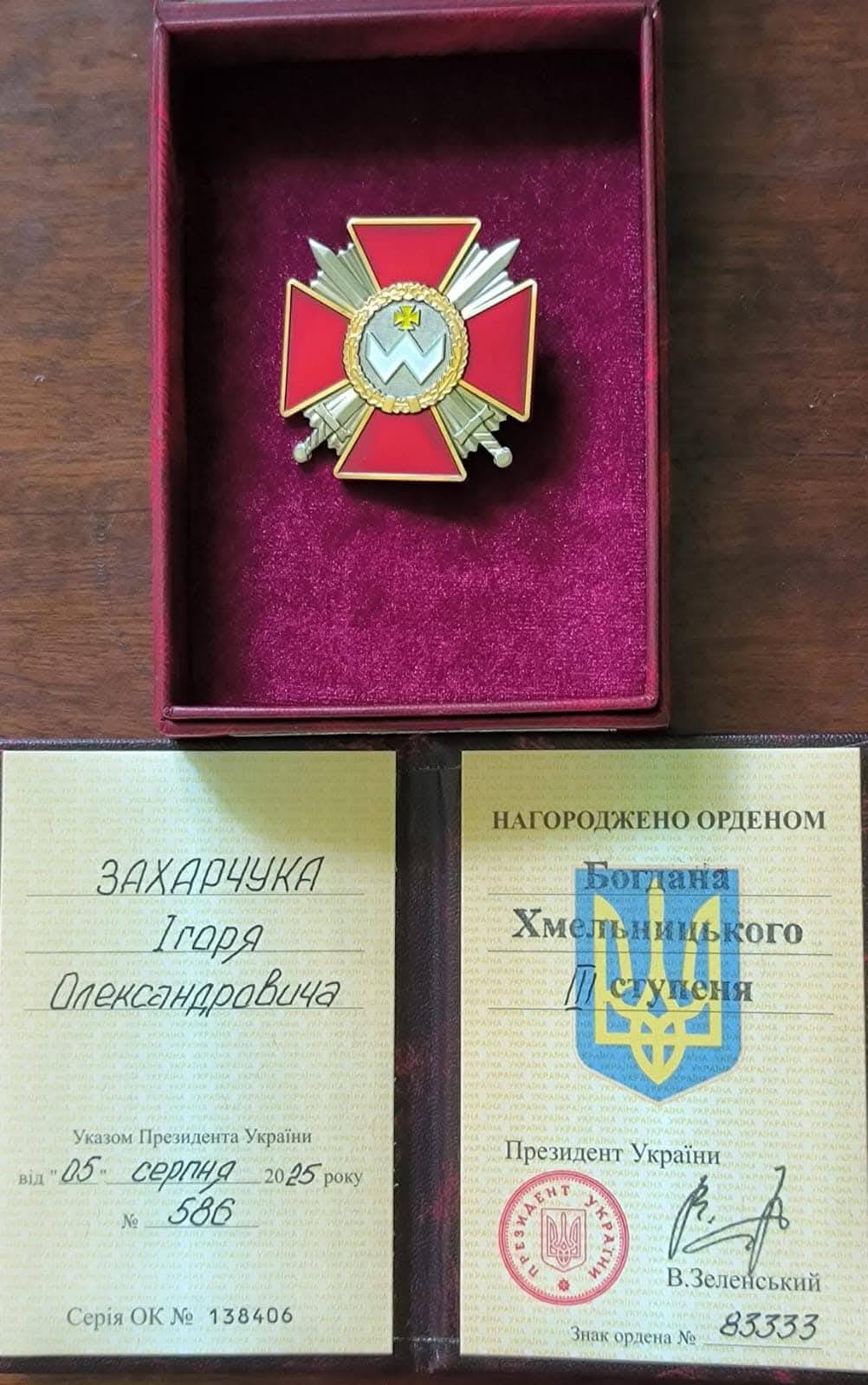 Захисник з Дрогобича Ігор Захарчук отримав орден Богдана Хмельницького ІІІ ступеня. Про це повідомив начальник Львівської ОВА Максим Козицький у понеділок, 8 вересня.