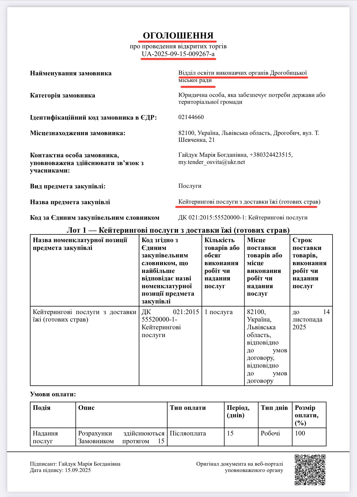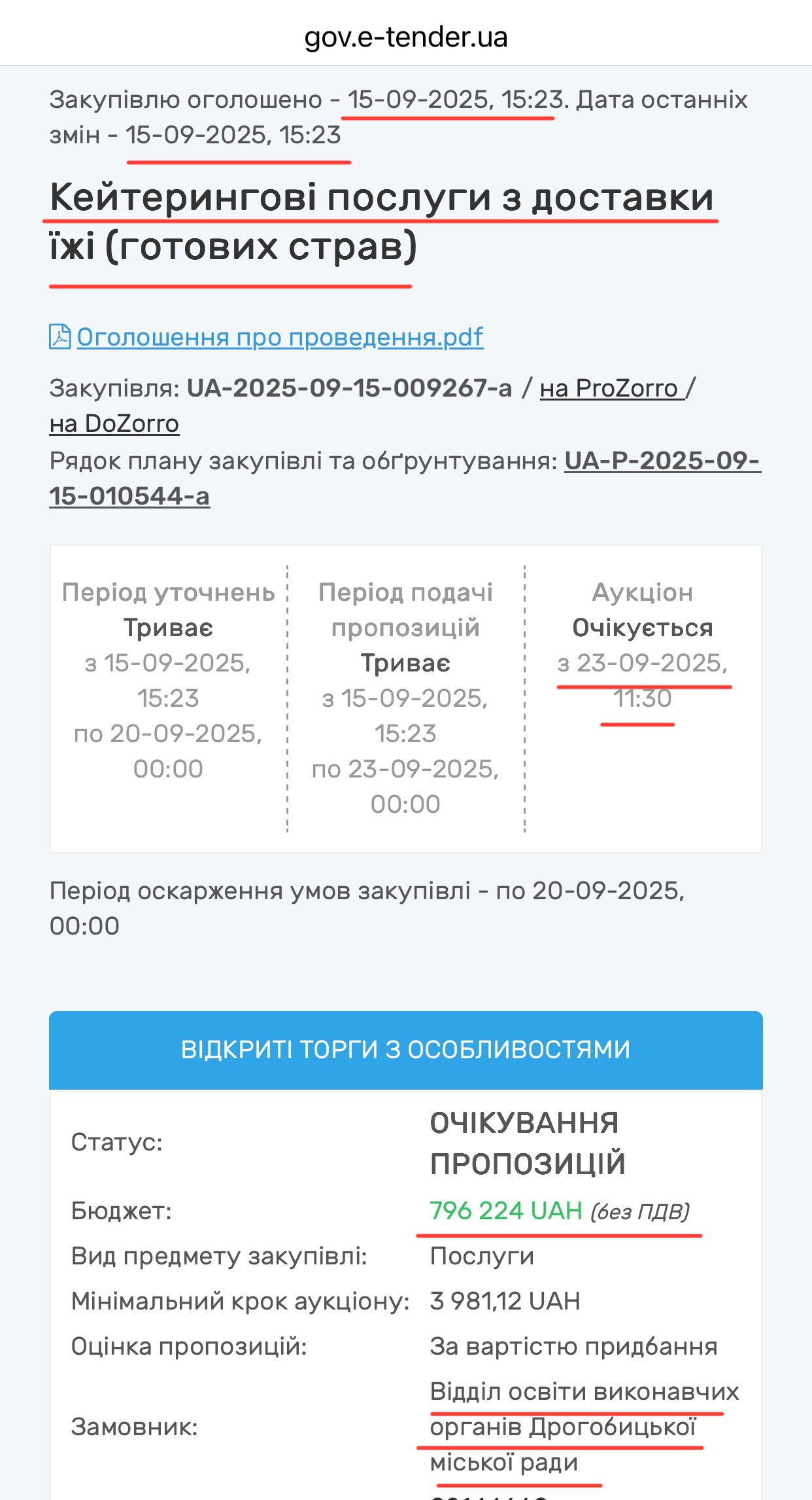 І тут найцинічніше: у той час як діти голодні, у новоперейменованому управлінні освіти сидить вже не 6, а цілих 10 чиновників із зарплатами під 40 000 гривень, які лише 15 вересня, коли діти давно мали б харчуватися, виставили закупівлю на “ПРОЗОРО”, саме Кейтерингові послуги з доставки їжі (готових страв) – майже на 800 000 гривень.