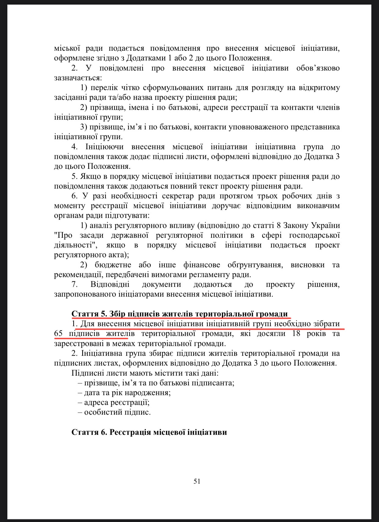 65 підписів жителів територіальної громади, які досягли 18 років та зареєстровані в межах територіальної громади.