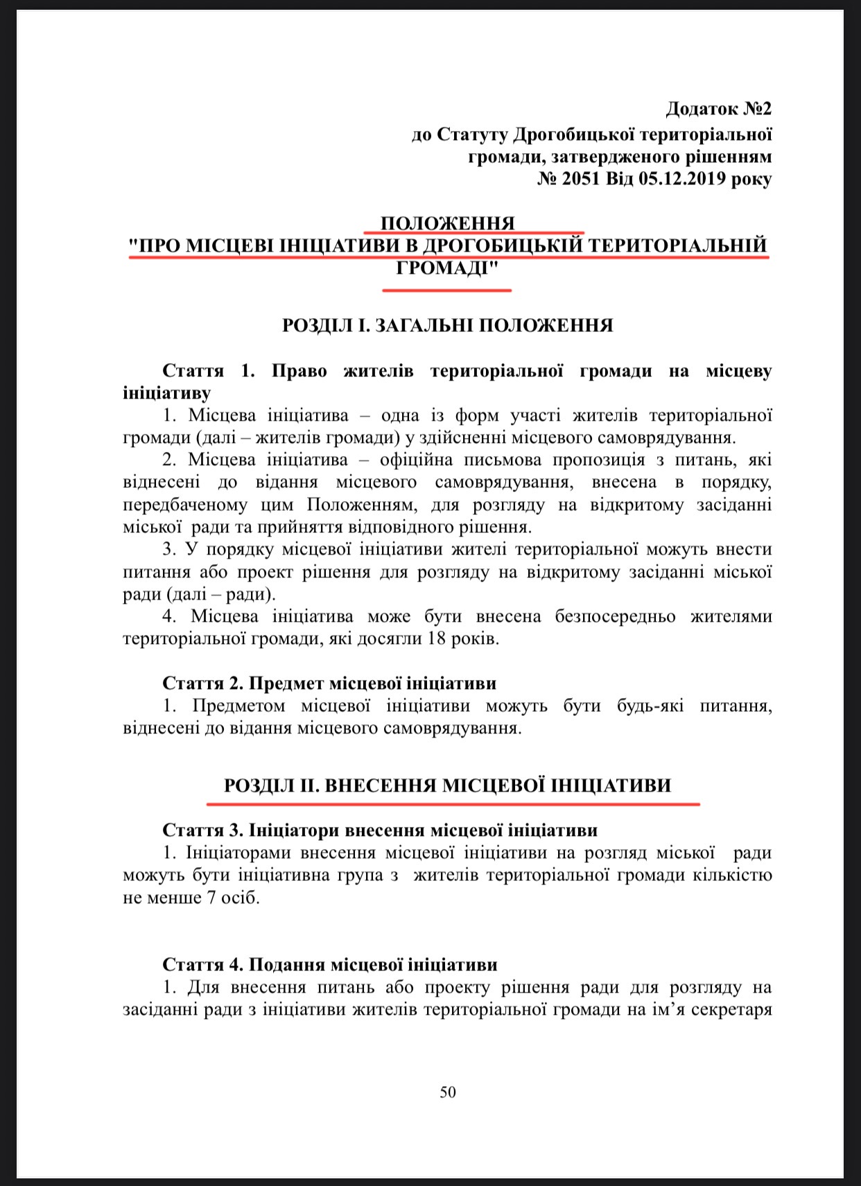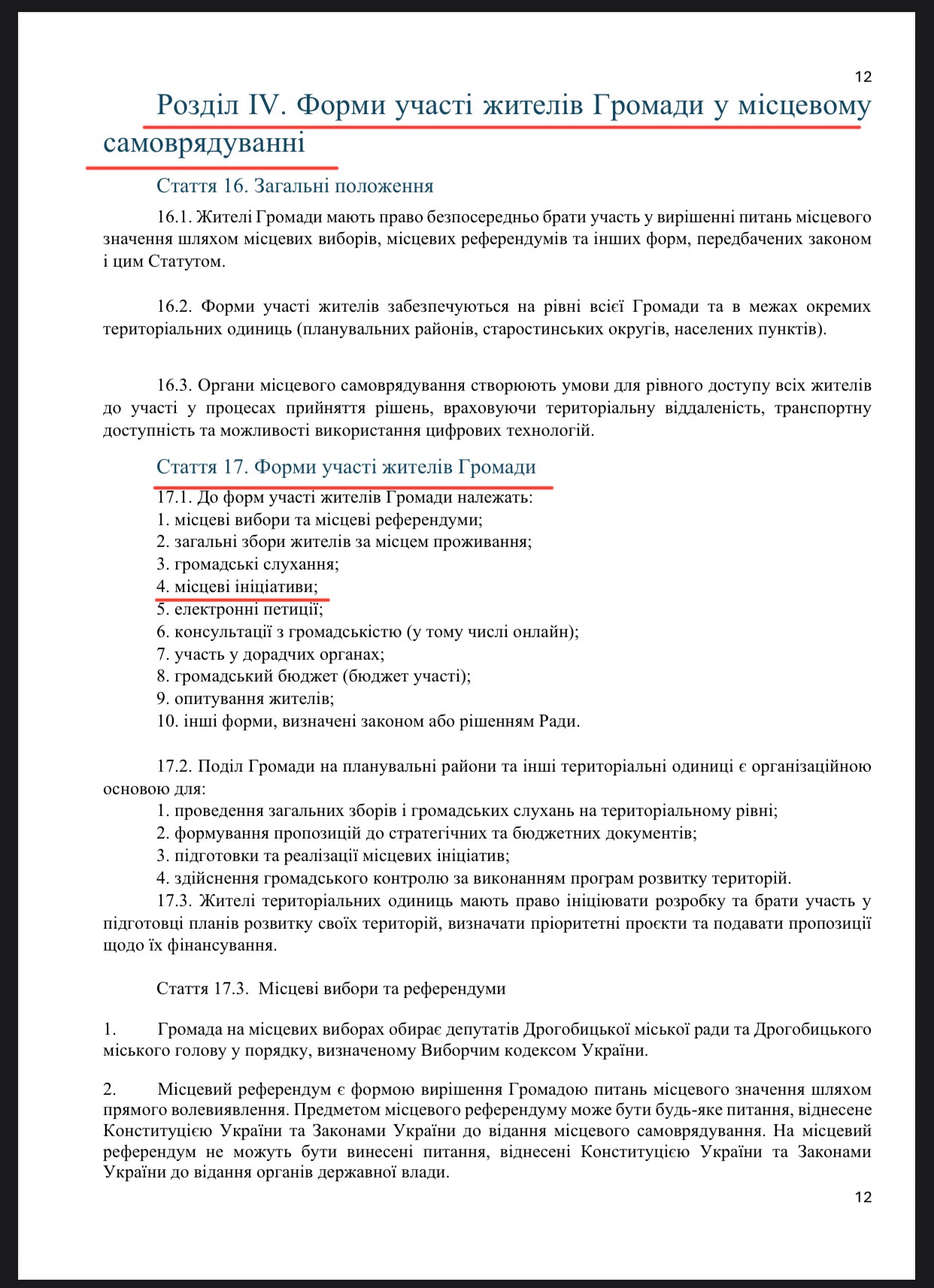 Мовляв, “Інститут міста Дрогобича” розробив новий документ, що визначає права, обов’язки та форми участі мешканців у місцевому самоврядуванні. Красиві слова про “підзвітність” і “прозорість” виглядають, як прикриття для справжнього наміру - позбавити громаду реальних важелів впливу.