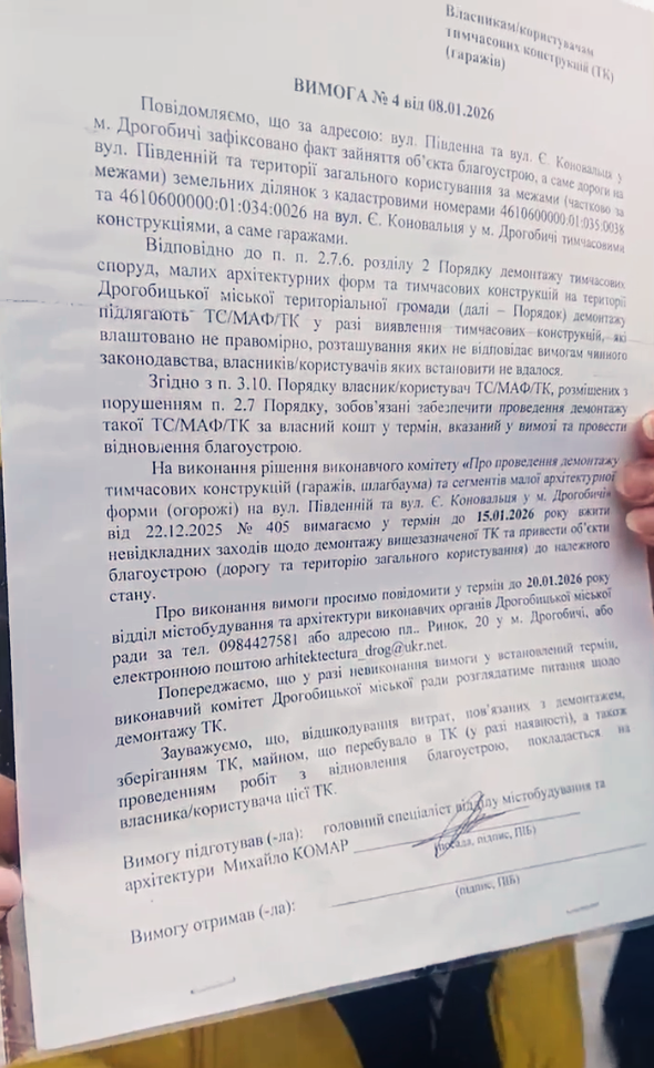 «8 січня, коли всі люди йдуть до церкви, на територію кооперативу знову приїжджають Комар, представники юридичного відділу і вручили письмову вимогу №4 від 08.11.2026 за підписом головного спеціаліста відділу містобудування та архітектури про забезпечення проведення демонтажу гаражів за власний кошт. Він повідомив, що виконує свою роботу і гаражі буде забирати», – прокоментувала подію Галина Юзьв’як. Надалі продемонструвала графічні документи і повідомила: «Коли я виробляла проєктну документацію у 2015 році, всі гаражі узаконювалися». Як вона запевнила присутніх, згідно документів на вул. Проєктній жодних гаражів немає, і зі слів представників влади, ця дорога тепер має бути настільки широкою, як автобан, бо тут, у спальному районі, будуть їздити фури на завод «Клуб чіпсів». Як сказали їй чиновники, «ви нам нецікаві, бо ви гаражний кооператив. Нам цікавий завод чіпсів, бо там інвестиції». «Я перепитала їх: куди інвестиції? У кишеню?» – запитала жінка і повідомила присутнім, що документація кооперативу відповідає всім вимогам, однак укладена угода про оренду землі з міською радою закінчується вже в цьому році. Тож суть не так у дорозі, як у «кеші» з інвестицій, в яких зацікавлені меркантильні особи з ратуші. Також додала, що Василь Качмар пише на неї брудні наклепи.